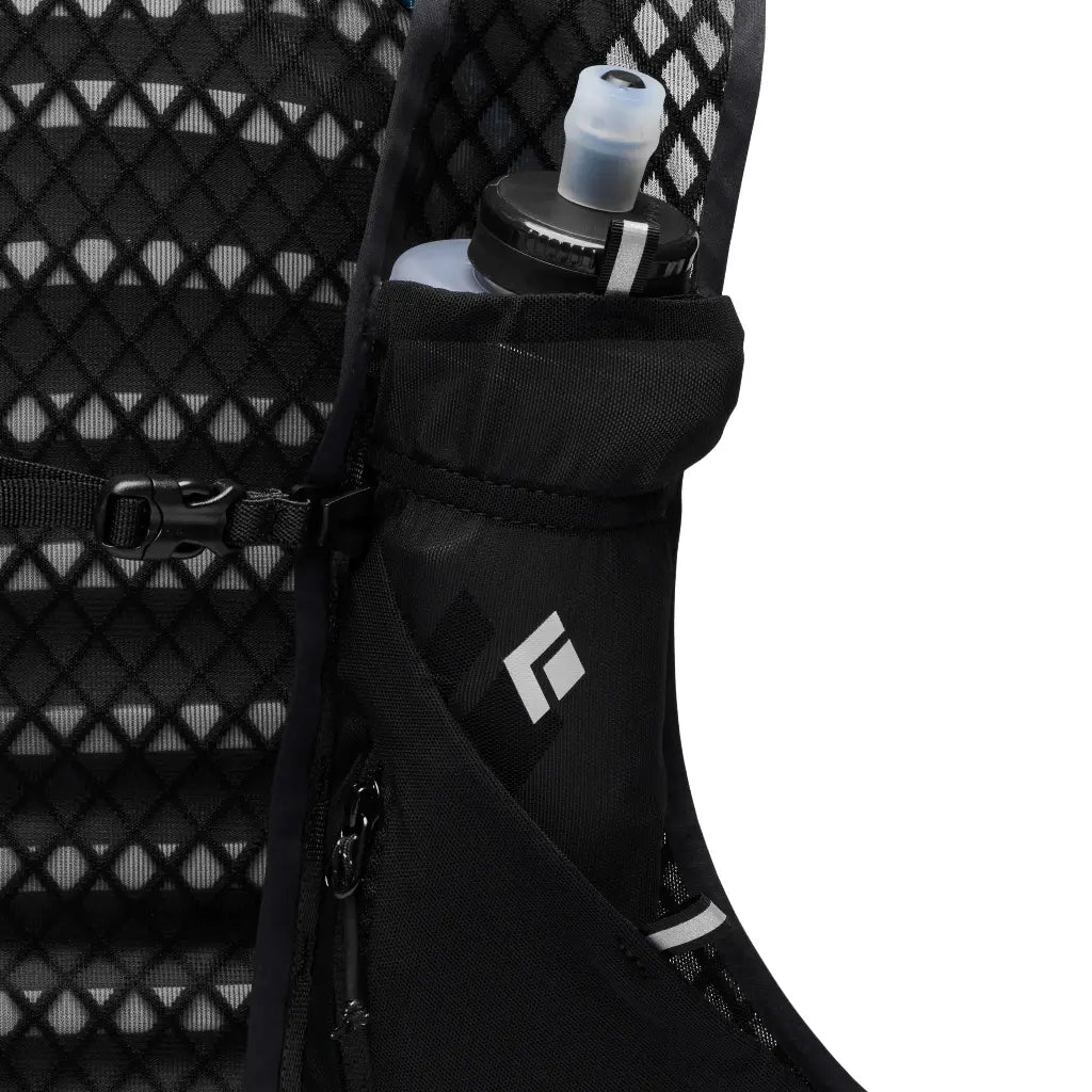 With a hybrid design that includes vest-inspired suspension for running, the Distance 15 combines lightweight technology with extra storage for mountain endeavors. The pack is made with BD SETT (Stitchless Edge Taping Technology) that improves fit, comfort and durability on the move. The Distance 15 features smooth edge binding, and soft and breathable custom engineered diamond mesh for next-to-skin comfort. Finally, soft-flask holsters improve security and front pockets provide secure storage. The Distance 15 is fully equipped with Z-Pole storage that’s easy to deploy on the go, plus dual piolet carry options.